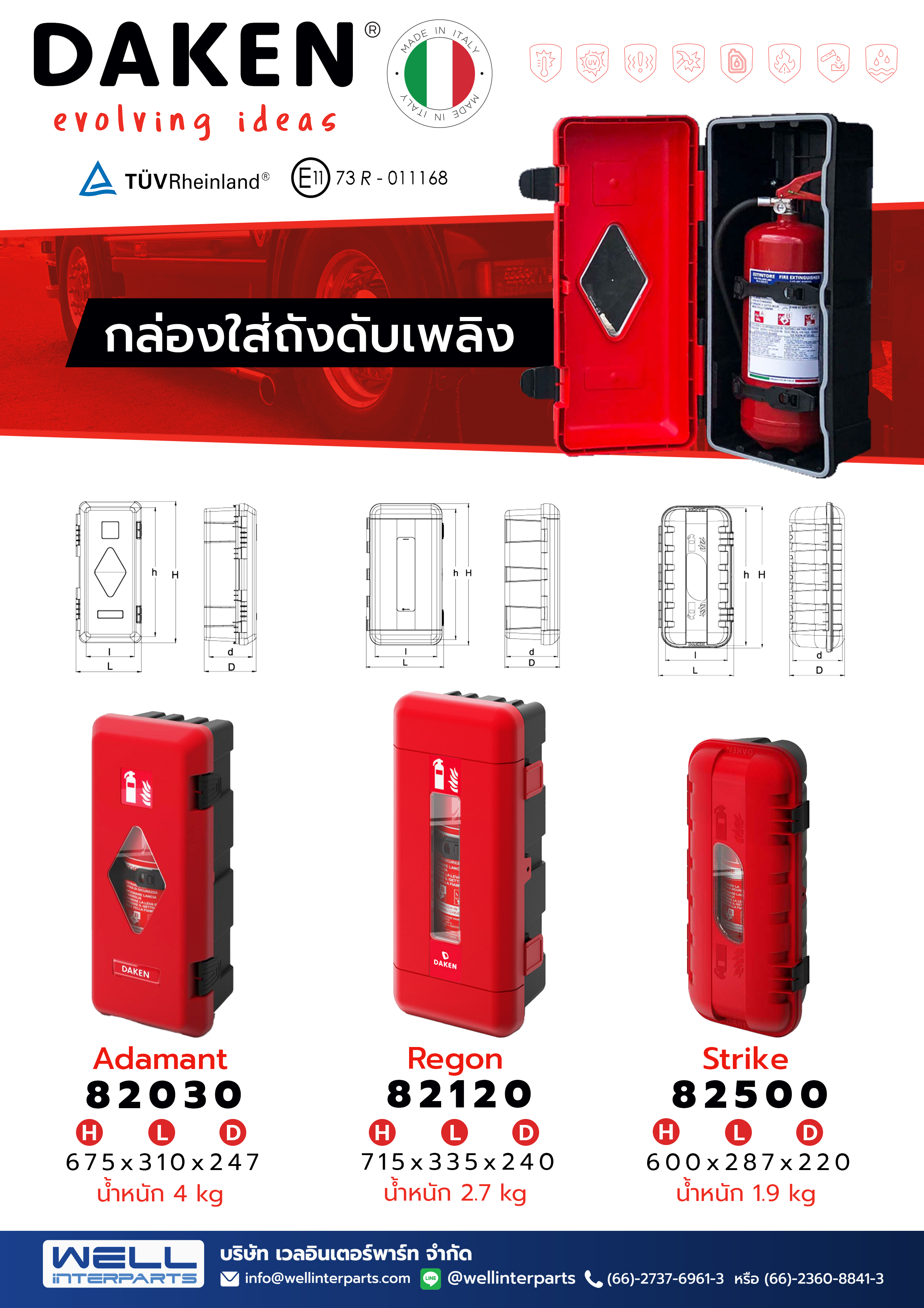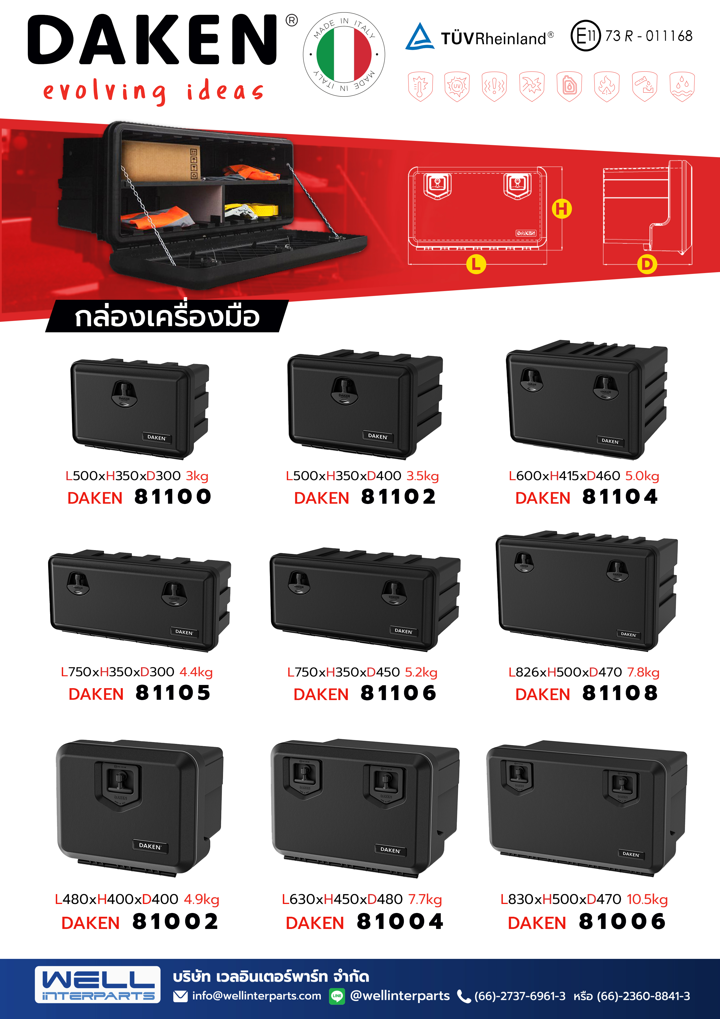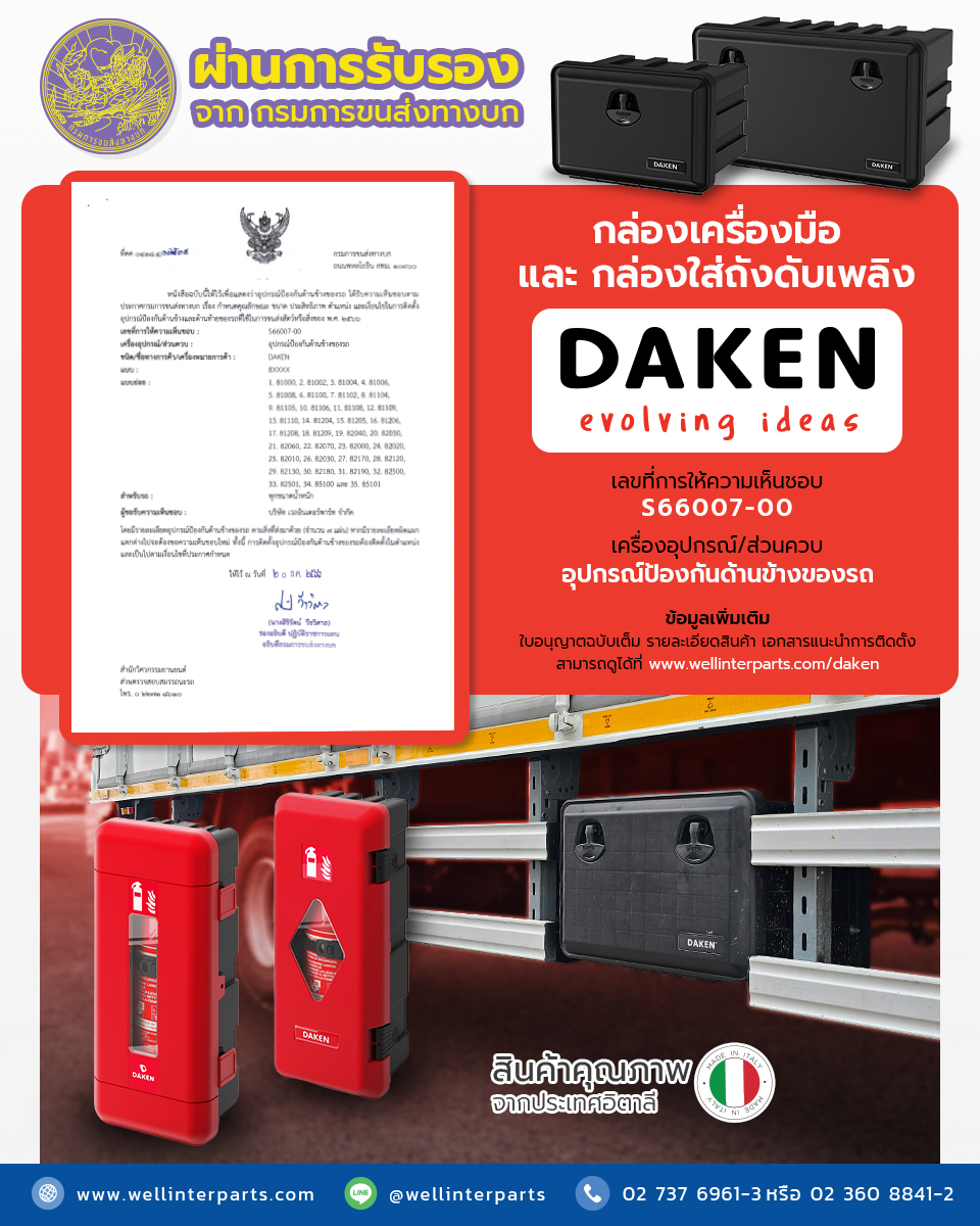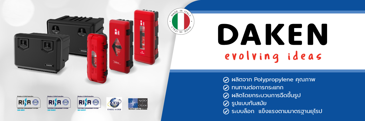 DAKEN กล่องเครื่องมือพลาสติกและกล่องใส่ถังดับเพลิง สินค้านำเข้าจากประเทศอิตาลี ผลิตจากวัตถุดิบคุณภาพสูง ทนทานต่อการกระแทก อีกทั้งผลิตด้วยกระบวนการฉีดขึ้นรูป ทำให้สินค้ามีความทนทาน รูปลักษณ์ทันสมัย ช่วยส่งเสริมความเป็นมาตรฐานให้แก่รถของคุณ ได้รับความเห็นชอบจากกรมการขนส่งทางบก สามารถเป็นเครื่องอุปกรณ์/ส่วนควบ อุปกรณ์ป้องกันด้านข้างของรถ ตามที่กรมการขนส่งกำหนด